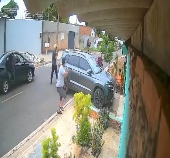 Os suspeitos chegaram ao local em um carro preto, desceram do veículo e anunciaram o assalto. A ação foi registrada por câmeras de segurança e as imagens mostram o momento em que a família é rendida e a moto levada pelos criminosos.