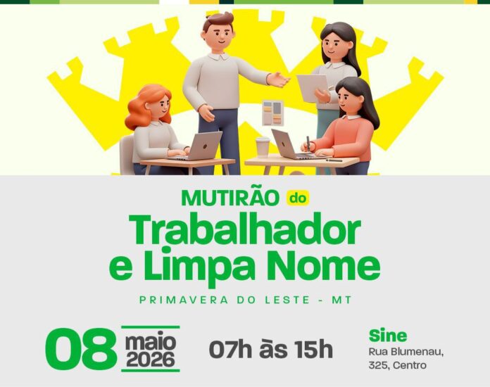 A Prefeitura de Primavera do Leste, por meio da Secretaria Municipal de Assistência Social em parceria com o SINE, realiza no dia 08 de maio de 2026 o “Mutirão do Trabalhador”, uma ação especial que integra as comemorações dos 40 anos do município.