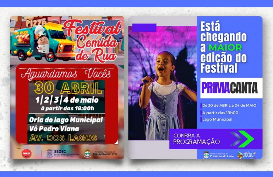 Dois importantes eventos do calendário gastronômico e cultural acontecem nesta semana em Primavera do Leste e levam diversão e comidas saborosas para o público na orla da Lagoa Vô Pedro Viana: Primacanta e o Festival de Comida de Rua. Essas ações integram a programação de comemoração dos 38 anos da cidade.