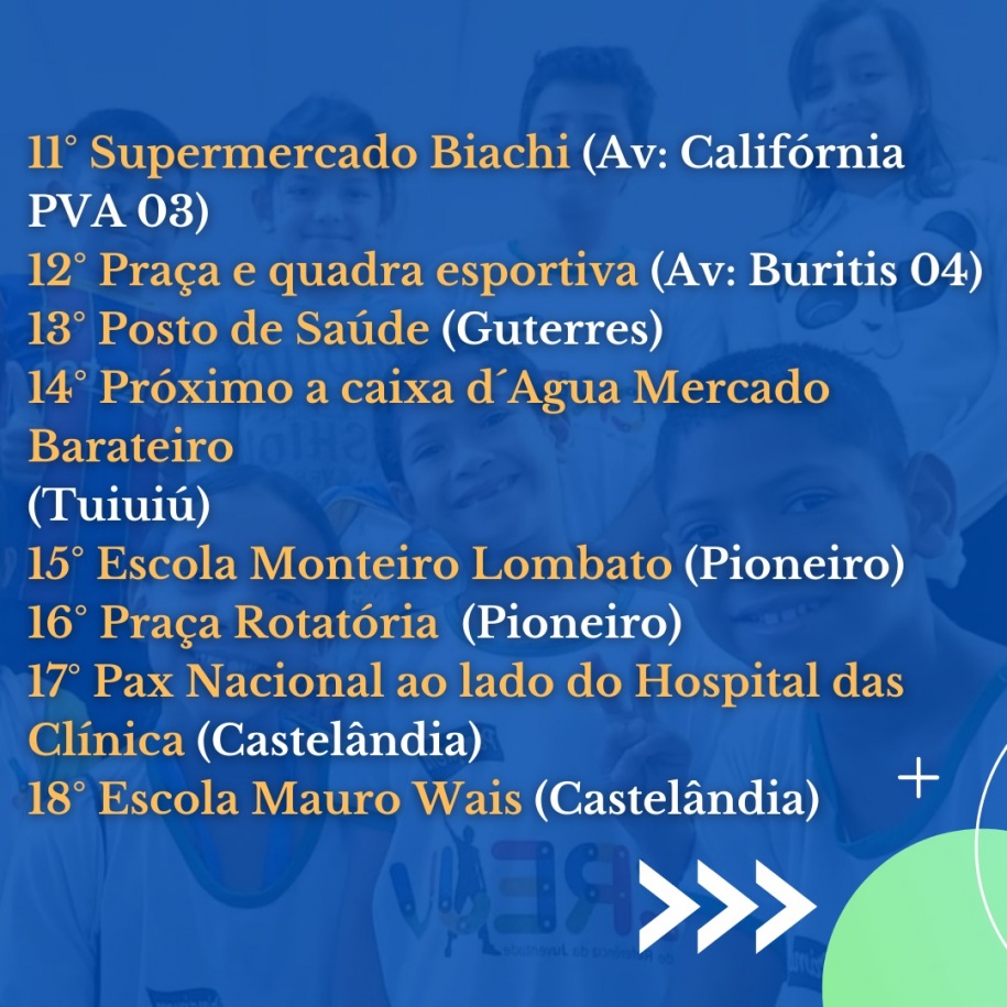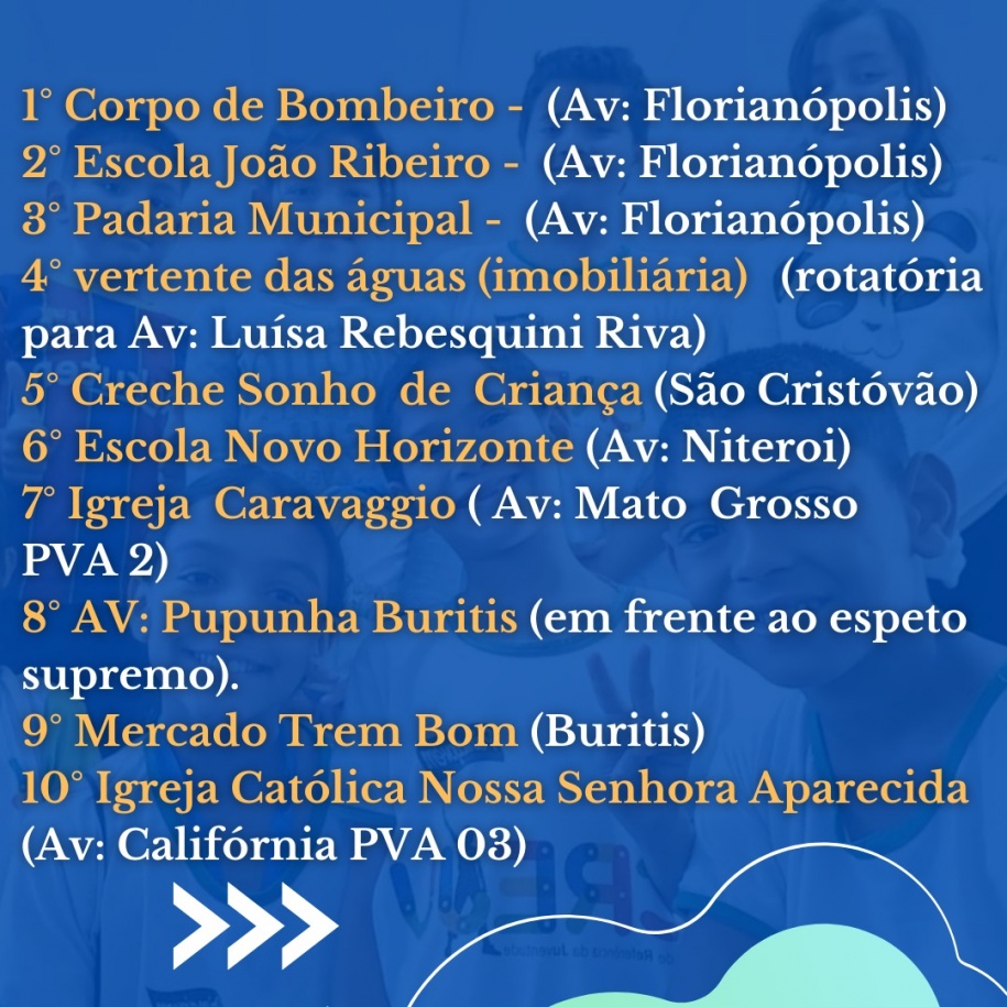 Vale também destacar que o projeto oferece transporte gratuito para os alunos. No período matutino o horário de início é às 6h30, com retorno às 10h30. Já o vespertino é às 12h40, com retorno às 16h30. São quase 20 pontos de ônibus, em toda a cidade, sendo o primeiro no corpo de bombeiros, na Avenida Florianópolis. Confira os locais: